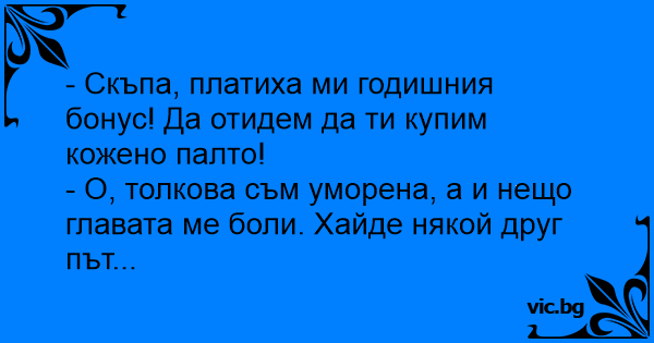 - Скъпа, платиха ми годишния бонус! Да отидем да ти купим кожено палто!