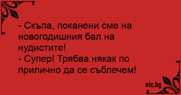 - Скъпа, поканени сме на новогодишния бал на нудистите!