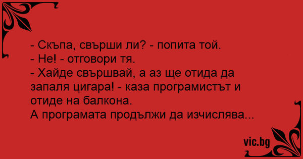 - Хайде свършвай, а аз ще отида да запаля цигара! - каза програмистът и отиде на балкона.