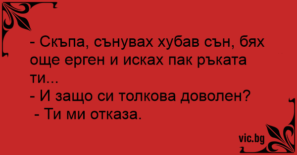 - Скъпа, сънувах хубав сън, бях още ерген и исках пак ръката ти...