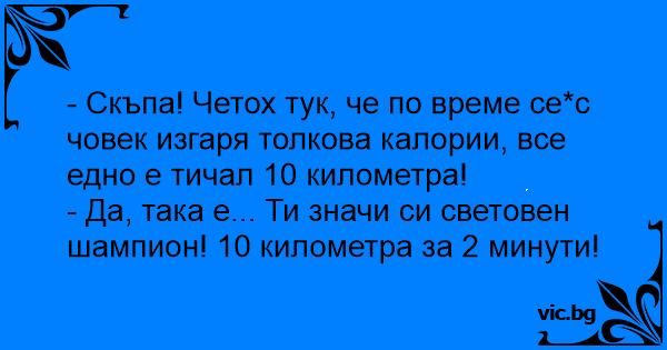 - Скъпа! Четох тук, че по време cekc човек изгаря толкова калории, все едно е тичал 10 километра!