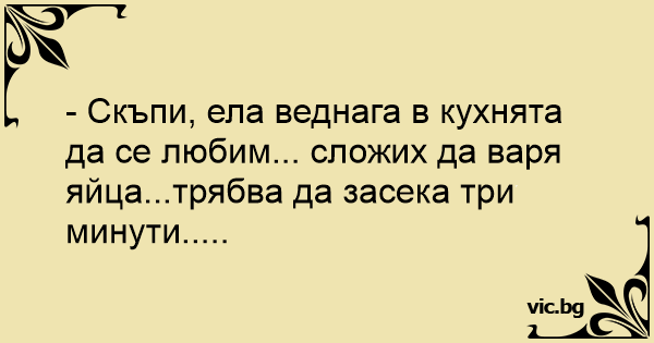 - Скъпи, ела веднага в кухнята да се любим... сложих да варя яйца...трябва да засека три минути.....