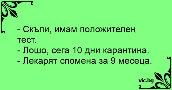 - Дорогой, у меня положительный тест. - Вот блин, теперь две недели карантина. - Врач сказал, что девять месяцев... - Kochanie, wynik testu jest pozytywny. - Kurde, musimy poczekać dwa tygodnie na kwarantannie! - Nie, lekarz powiedział, że w sumie musimy poczekać niecałe 9 miesięcy bez kwarantanny.