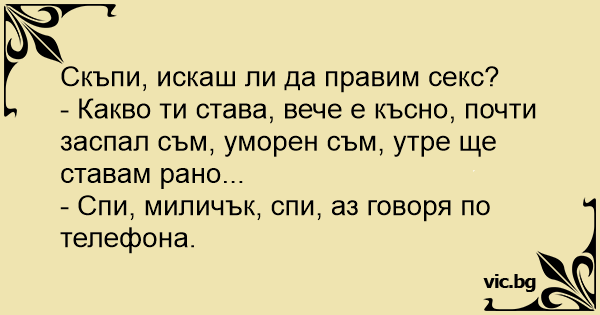 Късно през ноща мъж и жена са в леглото. - Любимая, давай займемся сексом! - Скъпа, хайде да правим с*кс? Трпе и Трпана во кревет. Трпе прашува: - Дали си за секс? - Не можам, уморна сум... - Ќути и спиј... нели гледаш дека зборувам на телефон. Środek nocy. Małżonkowie leżą w łóżku. Mąż szepcze: Kochanie poświntuszymy? Żona zaspanym głosem: Głowa mnie boli, mam niskie ciśnienie... Mąż: Śpij, śpij... ja przez telefon rozmawiam. Мажот и жената во кревет. - Мажот: Дали си расположена за секс? - Жената (поспано): - Не можам, уморна сум, а и главата ме боли. Мажот: Не бе, спиј си ти, зборувам на телефон...