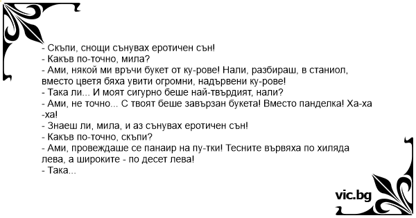 - Знаеш ли, мила, и аз сънувах еротичен сън!