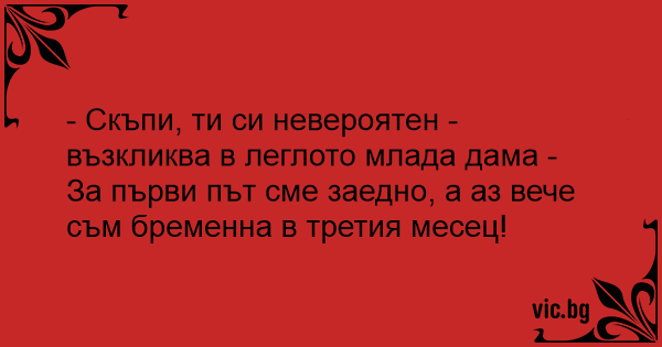 - Скъпи, ти си невероятен - възкликва в леглото млада дама - За първи път сме заедно, а аз вече съм бременна в третия месец!