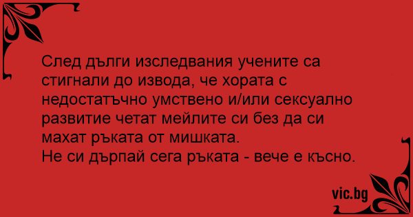След дълги изследвания учените са стигнали до извода, че хората с недостатъчно умствено и/или сексуално развитие четат мейлите си без да си махат ръката от мишката.