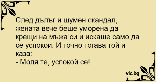 След дълъг и шумен скандал, жената вече беше уморена да крещи на мъжа си и искаше само да се успокои. И точно тогава той и каза:
