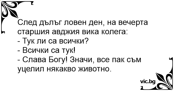 След дълъг ловен ден, на вечерта старшия авджия вика колега: