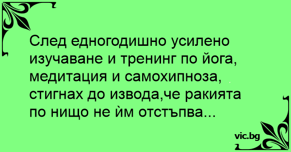 След едногодишно усилено изучаване и тренинг по йога, медитация и самохипноза, стигнаx до извода,че ракията по нищо не ѝм отстъпва...