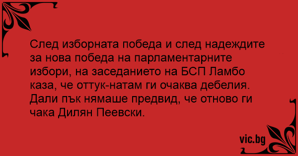 След изборната победа и след надеждите за нова победа на парламентарните избори, на заседанието на БСП Ламбо каза, че оттук-натам ги очаква дебелия. Дали пък нямаше предвид, че отново ги чака Дилян Пеевски.
