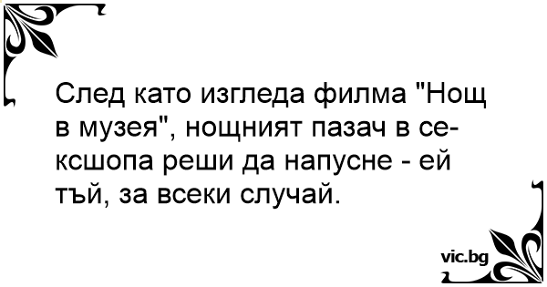 След като изгледа филма "Нощ в музея", нощният пазач в сексшопа реши да напусне - ей тъй, за всеки случай.