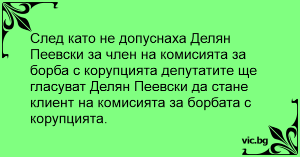 След като не допуснаха Делян Пеевски за член на комисията за борба с корупцията депутатите ще гласуват Делян Пеевски да стане клиент на комисията за борбата с корупцията.