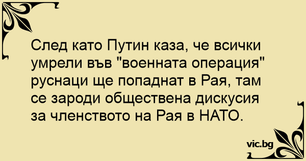 След като Путин каза, че всички умрели във "военната операция" руснаци ще попаднат в Рая, там се зароди обществена дискусия за членството на Рая в НАТО.