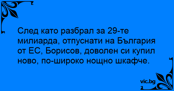 След като разбрал за 29-те милиарда, отпуснати на България от ЕС, Борисов, доволен си купил ново, по-широко нощно шкафче.