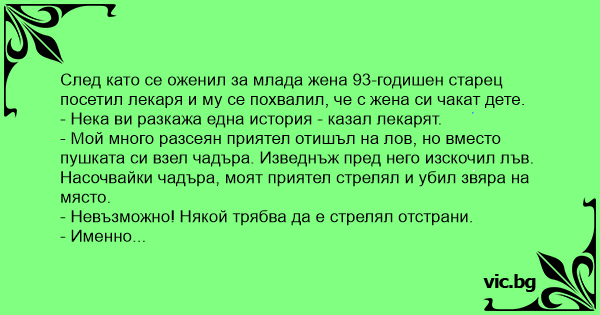 Дедото што се оженил со 18 годишна девојка Who Knocked Up My Bear? Αποκλείεται Един старец отива на лекар. 96-годишен дядка се жени за млада красавица. C'est un vieil homme de 80 ans qui va chez le docteur pour un examen annuel. - Докторе, приятелката ми е бременна, но аз използвам винаги кондом! Один 80-летний старик пришел к врачу на медосмотр. Ein Achtzigjähriger erzählt, dass seine junge Frau ein Kind bekommt. Ein Bekannter sagt zu ihm: A 90-year-old man said to his doctor, "I've never felt better. I have an18-year-old bride who is pregnant with my child. What do you think about that?" Un 80enne va dal dottore per sottoporsi al solito controllo annuale e quando gli viene chiesto come si sente, risponde: "Non sono mai stato meglio in vita mia, dottore! Ho appena sposato una ragazza di 20 anni, l'ho messa incinta e tra poco sarò padre. Che ne pensa?" Il dottore pensa un momento e... 85 yaşından da bir adam doğum hanenin kapısında beklemektedir. Doğumhaneden çıkan doktor şöyle bir bakındıktan sonra yaşlı adama sorar: Doktor- “içeride doğum yapan bayan yakınınız mı?” Adam- “Evet,eşim.” Doktor- “Ama bayan 25 yaşlarında…” Adam- “Tamam işte, eşim o. Niye şaşırdınız, baba olamaz... Een oude man van 98 jaar gaat naar zijn huisarts voor zijn jaarlijkse onderzoek. De arts vraagt hoe hij zich voelt. "Ik heb me nog nooit zo goed gevoeld. Mijn vriendin is 18 jaar en verwacht een... En gamling på 98 år gjorde sin årliga läkarundersökning. Läkaren frågade hur han kände sig: - Jag har aldrig mått bättre! Min fästmö är 18 år och är gravid och väntar mitt barn. Sååå... vad säger... Un homme de 80 ans se rend chez le docteur pour son examen annuel. Le docteur lui demande comment il se sent. "- Je ne me suis jamais senti aussi bien. Ma fiancée de 18 ans vient de tomber... Um homem de 85 anos estava em seu check-up anual e o médico pergunta como ele esta se sentindo. — Eu nunca me senti tão bem, disse ele. Minha nova esposa tem 18 anos e esta gravida! Esperando um... Egy idős bácsi ellenőrző vizsgálatra megy az orvosához. Az orvos kérdezi tőle, hogy van. - Nagyszerűen érzem magam, doktor úr. Egy éve újra megházasodtam. Az új feleségem 25 éves és 4 hónapos... Un anciano de 90 años llega al médico para su chequeo de rutina. El doctor le pregunta: ¿ Cómo se siente? ¡ Nunca estuve mejor!, mi novia tiene 18 años, ahora está embarazada y vamos a tener un... Egy 85 éves bácsi dicsekszik az orvosának, hogy fiatal felesége terhes lett. Mire az orvos: - Hadd meséljek el magának egy történetet! Egy ember elment vadászni, de olyan szórakozott volt, hogy... En gammel mand på 90 var ved lægen En gammel mand på 90 var ved lægen, for sin årlige helbredsundersøgelse, og lægen spurgte hvordan han havde det. "Jeg har aldrig haft det bedre", pralede han.... 98-letni staruszek przychodzi do lekarza na badania kontrolne. Lekarz pyta go o Samopoczucie, na co staruszek odpowiada: - Nigdy nie czułem się lepiej. Mam 18-letnią narzeczoną. Jest w ciąży i... Sr. João de 80 anos vai ao médico fazer o chekup. — O Dr. pergunta com vai sr. João. — Estou muito bem Dr. Veja só minha mulher é jovem tem 25 anos e estha esperando um filho meu. Poderia estha... O velho de 90 anos vai ao médico fazer os exames de rotina quando o médico lhe pergunta: — Como o senhor está se sentindo? O velho diz: — Meu filho, eu me sinto muito bem... a minha esposa tem 20...