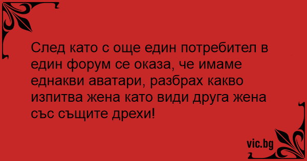 След като с още един потребител в един форум се оказа, че имаме еднакви аватари, разбрах какво изпитва жена като види друга жена със същите дрехи!