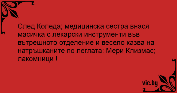 След Коледа; медицинска сестра внася масичка с лекарски инструменти във вътрешното отделение и весело казва на натръшканите по леглата: Мери Клизмас; лакомници !
