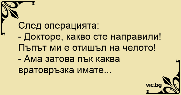 - Докторе, какво сте направили! Пъпът ми е отишъл на челото!
