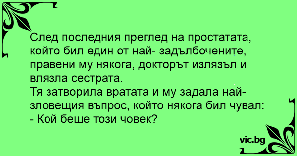 След последния преглед на простатата, който бил един от най- задълбочените, правени му някога, докторът излязъл и влязла сестрата.