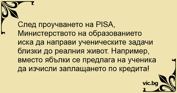 След проучването на PISA, Министерството на образованието иска да направи ученическите задачи близки до реалния живот. Например, вместо ябълки се предлага на ученика да изчисли заплащането по кредита!