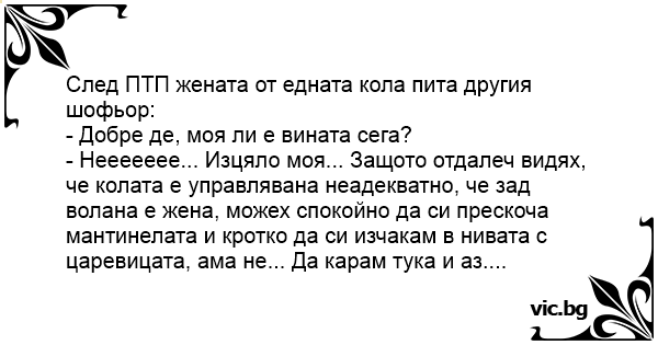 - Неееееее... Изцяло моя... Защото отдалеч видях, че колата е управлявана неадекватно, че зад волана е жена, можех спокойно да си прескоча мантинелата и кротко да си изчакам в нивата с царевицата, ама не... Да карам тука и аз....