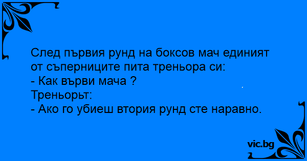 След първия рунд на боксов мач единият от съперниците пита треньора си:
