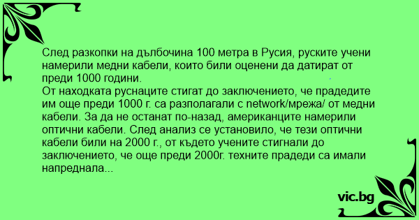 От находката руснаците стигат до заключението, че прадедите им още преди 1000 г. са разполагали с network/мрежа/ от медни кабели. За да не останат по-назад, американците намерили оптични кабели. След анализ се установило, че тези оптични кабели били на 2000 г., от където учените стигнали до заключението, че още преди 2000г. техните прадеди са имали напреднала в технологиите оптична мрежа, цели 1000г. преди руснаците да си направят мрежата от обикновени медни кабели. Една седмица по-късно българите публикували следната информация: "След разкопки на дълбочина 5000 м., българските учени не намерили абсолютно нищо. От това те стигнали до заключението, че преди 5000г. прадедите ни са разполагали вече с wireless internet.