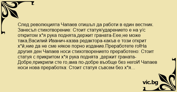 Занесъл стихотворение: Стоит статуя/ударението е на у/с откритом хуя рука поднята,держит граната-Еее,не може така,Василий Иванич-казва редактора-какъв е този открит хуй,ние да не сме някое пopнo издание.Преработете го!На другия ден Чапаев носи стихотворението преработено: Стоит статуя с прикритом хуя рука поднята ,держит граната-Добре,прикрили сте го,ама по-добре въобще без негоИ Чапаев носи нова преработка: Стоит статуя съвсем без хуя рука поднята,держит граната-Не може ли изобщо да го няма-настоява редактора и Чапаев пристига с окончателния вариант: Стоит статуя,рука поднята наместо хуя держит граната