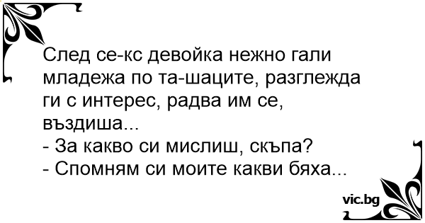 Efter samlaget stryker hon sin älskares penis. Han: - Vill du ha sex igen? - Nej, jag bara beundrar din penis… Jag hade en sån en gång!