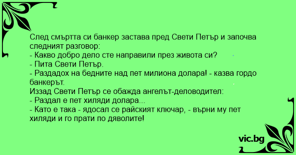 След смъртта си банкер застава пред Свети Петър и започва следният разговор: