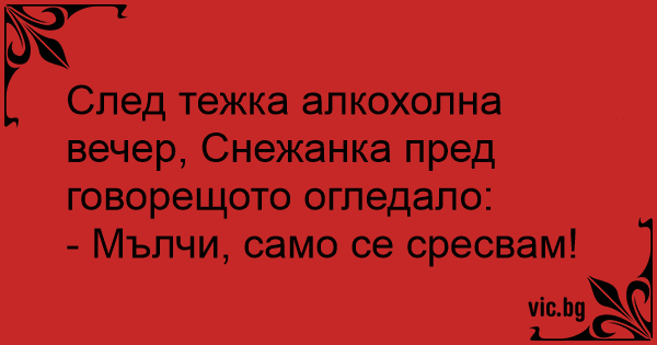 След тежка алкохолна вечер, Снежанка пред говорещото огледало: