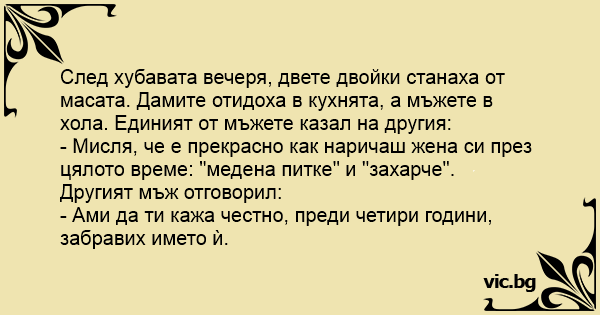След хубавата вечеря, двете двойки станаха от масата. Дамите отидоха в кухнята, а мъжете в хола. Единият от мъжете казал на другия: