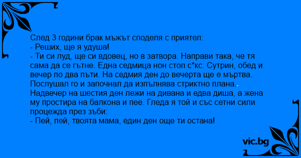 - Ти си луд, ще си вдовец, но в затвора. Направи така, че тя сама да се гътне. Една седмица нон стоп cekc. Сутрин, обед и вечер по два пъти. На седмия ден до вечерта ще е мъртва.