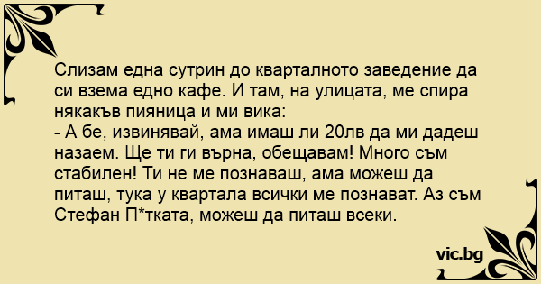 - А бе, извинявай, ама имаш ли 20лв да ми дадеш назаем. Ще ти ги върна, обещавам! Много съм стабилен! Ти не ме познаваш, ама можеш да питаш, тука у квартала всички ме познават. Аз съм Стефан пуtkata, можеш да питаш всеки.