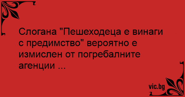 Слогана "Пешеходеца е винаги с предимство" вероятно е измислен от погребалните агенции ...