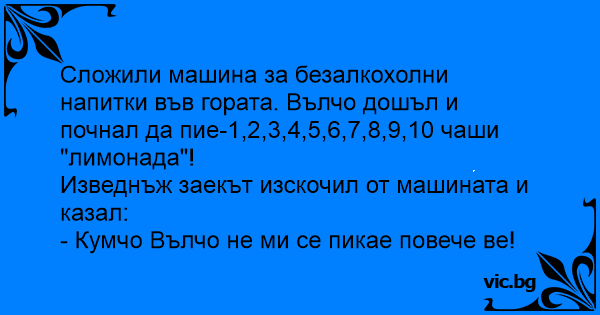 Сложили машина за безалкохолни напитки във гората. Вълчо дошъл и почнал да пие-1,2,3,4,5,6,7,8,9,10 чаши "лимонада"!