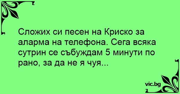Сложих си песен на Криско за аларма на телефона. Сега всяка сутрин се събуждам 5 минути по рано, за да не я чуя...