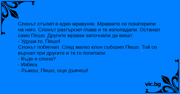 Слонът стъпил в един мравуняк. Мравките се покатерили на него. Слонът разтърсил глава и те изпопадали. Останал само Пешо. Другите мравки започнали да викат: