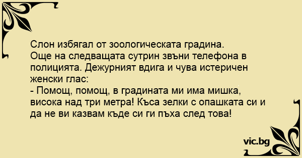 Із зоопарку втік слон. Лунає дзвінок в поліцію: — У мене на городі велика миша рве хвостом капусту. — І що вона з нею робить далі? — Ви не повірите...