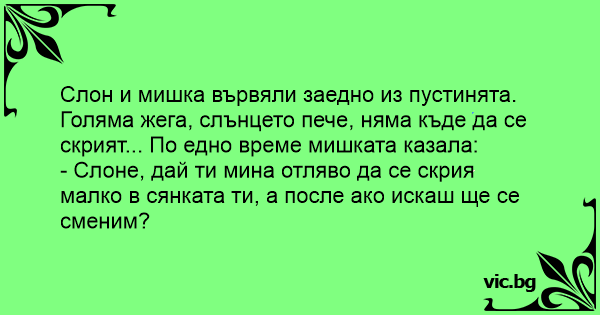 - Слоне, дай ти мина отляво да се скрия малко в сянката ти, а после ако искаш ще се сменим?