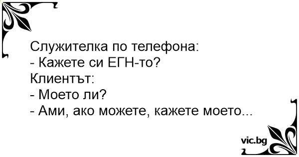 Служителка по телефона:<br />- Кажете си ЕГН-то?<br />Клиентът:<br />- Моето ли?<br />- Ами, ако можете, кажете моето...