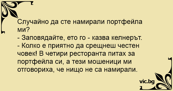 - Колко е приятно да срещнеш честен човек! В четири ресторанта питах за портфейла си, а тези мошеници ми отговориха, че нищо не са намирали.