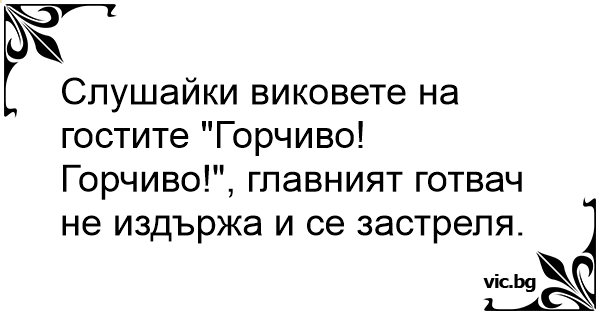 Слушайки виковете на гостите "Горчиво! Горчиво!", главният готвач не издържа и се застреля.