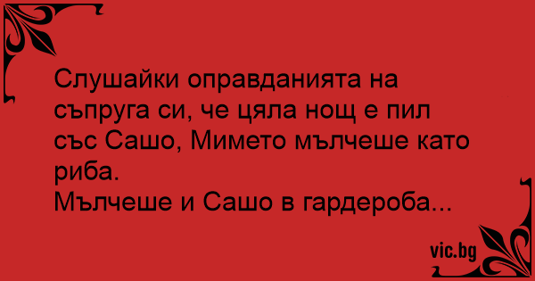 Слушайки оправданията на съпруга си, че цяла нощ е пил със Сашо, Мимето мълчеше като риба.