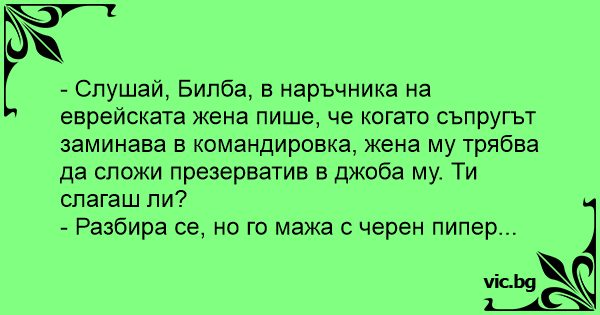 - Слушай, Билба, в наръчника на еврейската жена пише, че когато съпругът заминава в командировка, жена му трябва да сложи пpeзepbatиb в джоба му. Ти слагаш ли?