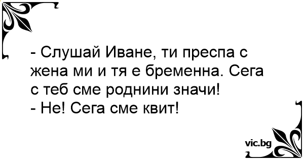 - Слушай Иване, ти преспа с жена ми и тя е бременна. Сега с теб сме роднини значи!