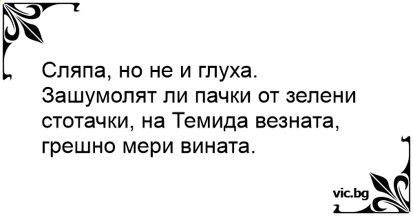Сляпа, но не и глуха. Зашумолят ли пачки от зелени стотачки, на Темида везната, грешно мери вината.
