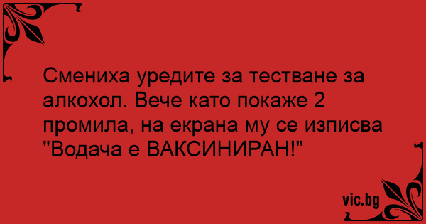 Смениха уредите за тестване за алкохол. Вече като покаже 2 промила, на екрана му се изписва "Водача е ВАКСИНИРАН!"