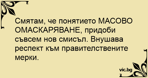 Смятам, че понятието МАСОВО ОМАСКАРЯВАНЕ, придоби съвсем нов смисъл. Внушава респект към правителствените мерки.